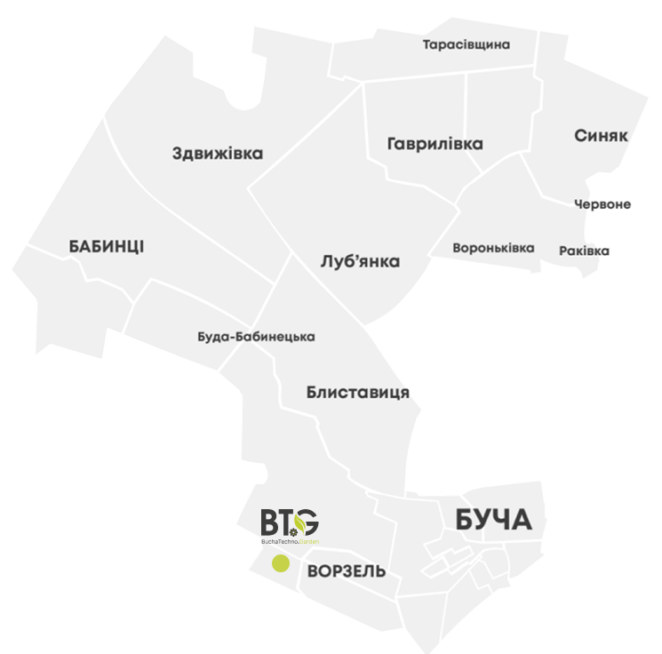 Індустріальний паркт БТГ знаходиться на території Бучанської міської територіальної громади. Бучанська громада розташована близько до столиці України – Києва – та має великий інвестиційний потенціал з вигідними умовами для вкладення коштів у виробництво. Бучанська міська територіальна громада (як і Бучанський район) входить до складу Київської агломерації, що є найбільшою в Україні за населенням, площею і фінансово- економічними показниками.